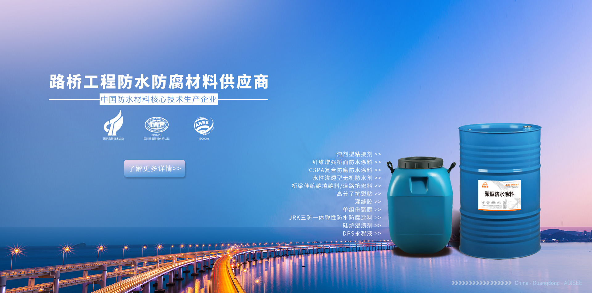 廣東愛(ài)迪斯新型材料科技有限公司廣州分公司 隔音隔熱系列 路橋及防腐防水系列 家裝工程防水系列 修繕補(bǔ)漏防水系列專業(yè)承接路橋防水防腐工程施工及防水材料銷售,路橋防水工程遍布全國(guó)各地,多年的技術(shù)經(jīng)驗(yàn)積累了一整套橋面防水病害處理方案,專業(yè)的路橋防水技術(shù),配套路橋防水施工設(shè)備,圓滿完成路橋防水施工任務(wù),用戶滿意度評(píng)價(jià)高,處橋梁防水行業(yè)技術(shù)領(lǐng)先水...